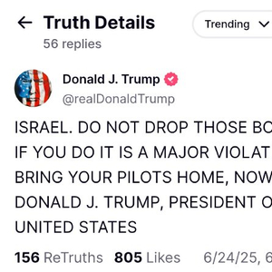 特朗普在社交媒体Truth Social上喊话以色列:不要扔那些炸弹,如果这样做就是严重违规。现在就让你们的飞行员回国。