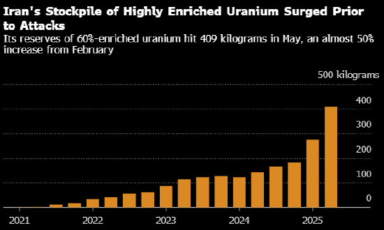 IAEA于5月报告称,伊朗已积累了409公斤(902磅)丰度达60%的铀,较三个月前记录的数量几乎增加了50%。