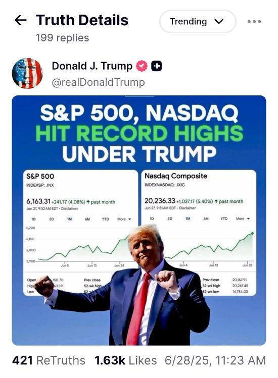 特朗普晒图:标普500与纳指“在特朗普的领导下”创新高