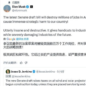 马斯克在社交平台X转发了有关新版法案“提高了所有尚未开工建设的风电和太阳能项目的税率”的消息,并回复称:“参议院最新的法案草案将摧毁美国数百万个工作岗位,并对我们国家造成巨大的战略损害!”