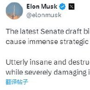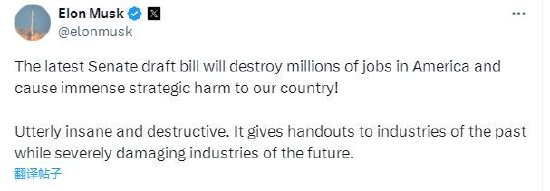 “参议院最新的法案草案将摧毁美国数以百万计的就业机会,并对我们的国家造成巨大的战略伤害!”马斯克周六写道。美国参议院正计划就这份近1000页的法案进行投票辩论。