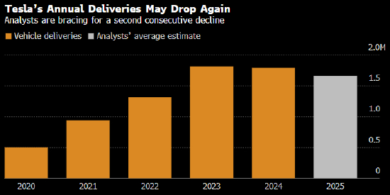 缺少全新车型或平价版Model 3或Model Y可能延长特斯拉的销售低迷期。大多数分析师预计,特斯拉2025年销量将连续第二年下降。