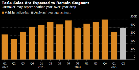 分析师预测显示,特斯拉2025年第二季度交付量约为39.06万辆,同比下降约12%。第一季度跌幅13%。