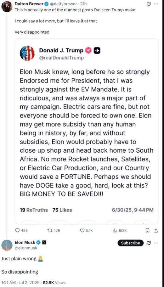 当地时间周三,明尼苏达州的特斯拉车主道尔顿·布鲁尔(Dalton Brewer)在X上分享了特朗普的帖子截图,并补充道:“这实际上是我见过的特朗普发过的最愚蠢的帖子之一。我可以说更多,但我就讲到这里。非常失望。”