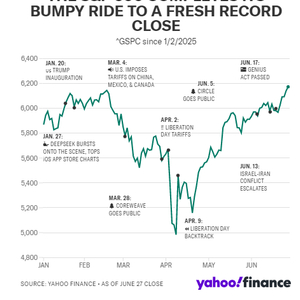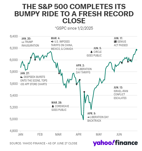 标普 500 指数(^GSPC)在起伏波动中结束了 2025 年上半年,创下历史新高。