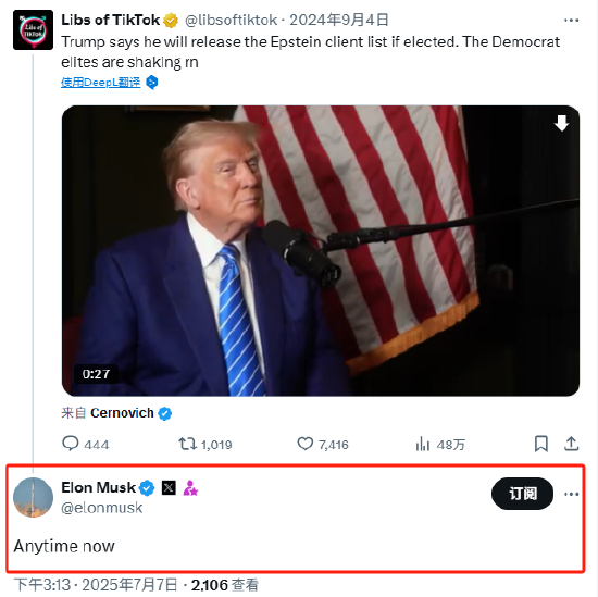 马斯克评论一条发布时间为去年9月份的视频贴文,称现在随时都可以(公开爱泼斯坦文件)。在视频中,特朗普在接受采访时表示,如果当选,他将公布爱泼斯坦的客户名单。