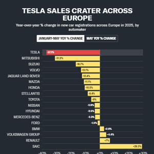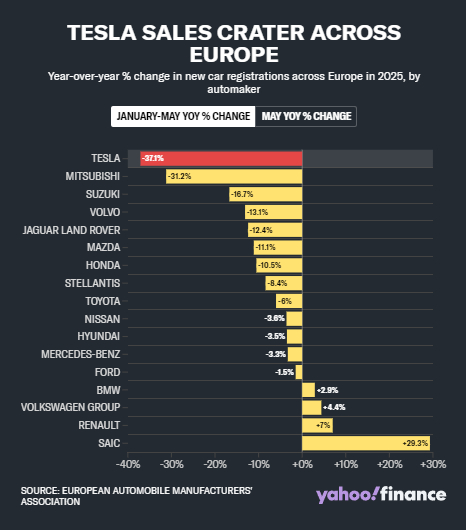 欧洲汽车制造商协会的数据显示,最近,特斯拉 5 月份在欧洲的电动汽车注册量(可作为销量的参考)同比下降 27.9%。与此同时,该地区(包括英国和欧洲自由贸易联盟)的整体电动汽车注册量 5 月份增长了 25%,而总注册量下降了 0.6%。