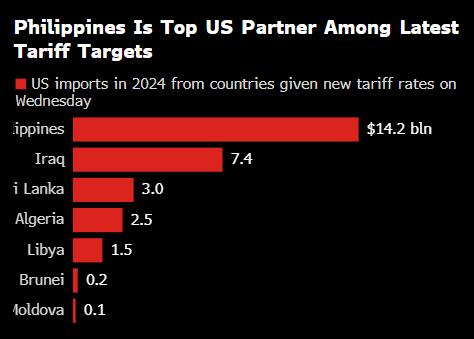 到目前为止,特朗普在周三声明中提到的七个国家中,只有菲律宾跻身美国前五十大贸易伙伴之列,该国去年向美国出口了约141亿美元的商品。菲律宾通常在美国市场上销售的产品包括电子产品、汽车零部件和纺织品。