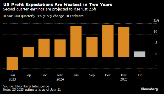 这种乐观情绪将面临关键考验,因包括摩根大通和花旗集团在内的多家大型银行将于本周开启财报季。根分析师预计标普500指数成分股公司将公布第二季度盈利增长2.5%,为2023年年中以来的最小增幅。