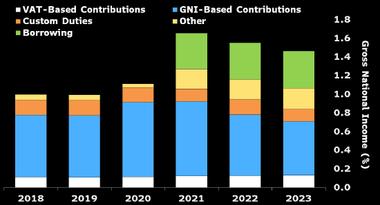 2020年,欧盟各成员国政府达成了一项历史性协议,根据“下一代欧盟”计划(NGEU)发行联合债务用于支持新冠疫情后的复苏。欧盟最多可以在市场上借入7,120亿欧元(约占欧盟GDP的5%),其中2,910亿欧元用于背对背贷款,4,210亿欧元用于直接支出(包括3,380亿欧元拨款)。后一项的偿还将给欧盟预算带来负担。