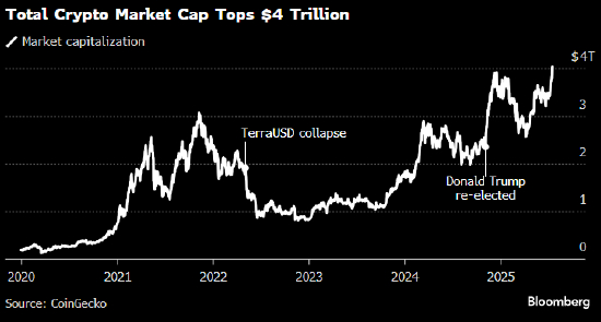 加密资产总市值首次突破4万亿美元,受代币上涨和美国立法推动行业监管的推动。