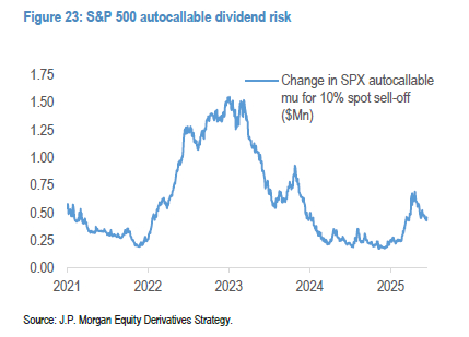 摩根大通策略师在 6 月的一份研究报告中写道,结构性产品的持仓 “表明,如果市场抛售,自动赎回型产品对冲者的技术性抛售可能对标普 500 指数股息构成适度风险”。
