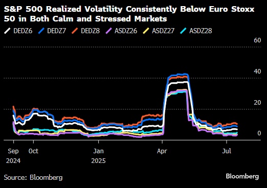 在平静和紧张的市场中,标普 500 指数的实际波动率始终低于 Euro Stoxx 50 指数