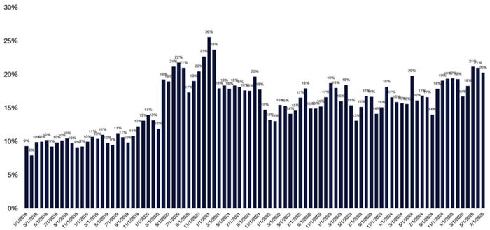今年夏季市场“反弹之火”背后,散户成为牛市“增程器”。数据显示,2025年美国散户通过股票与ETF已净流入高达1550亿美元,持股市值创历史新高,约占美国家庭金融资产的49%,若涵盖401K等间接持仓,占比接近60%。投机型参与者持续“买买买”,大幅强化了市场“逢低买入”的惯性。