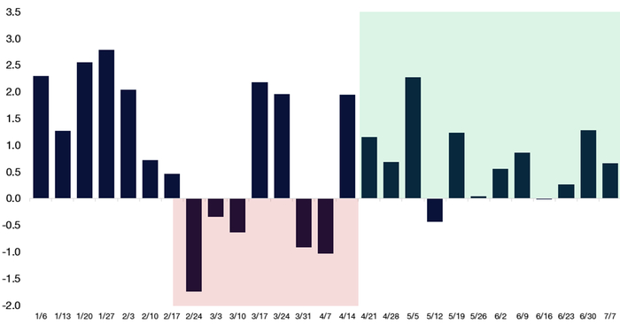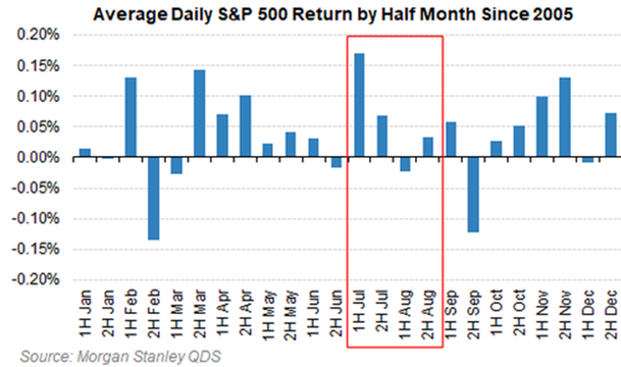 7月的季节性因素对美国股票非常有利。自1928年以来,7月是标普500指数一年中表现最好的月份,而9月是表现最差的月份,因为投资者要"返校"。标普500指数有望在7月实现连续第11个月上涨。Citadel Securities的夏季交易活动与股票需求的大幅增加一致,而其他投资者则远离他们的交易终端。