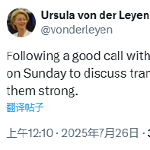 欧盟委员会主席乌尔苏拉·冯德莱恩将前往苏格兰,于周日与特朗普会面,双方期望在周五的最后期限之前达成协议,否则欧盟输美产品将面临30%的关税。