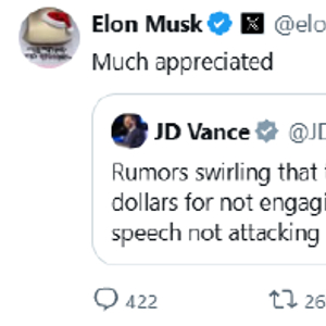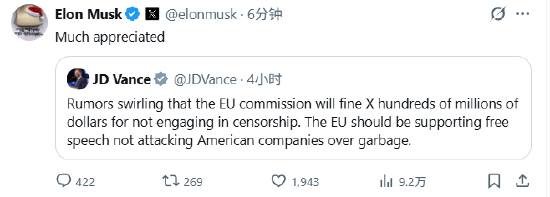 万斯批评欧盟拟对X处以数亿美元罚款,马斯克表示感谢