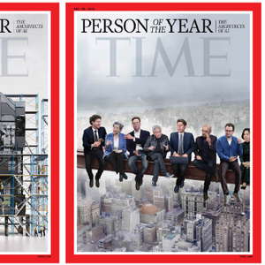 该杂志为其“年度人物”特刊发布了两张封面图片。右图由数字艺术家杰森·塞勒创作,它对1932年的照片《摩天楼顶上的午餐》进行了重新演绎,将照片中的铁匠换成了来自顶尖科技和AI公司的高管,包括马克·扎克伯格(Meta)、苏姿丰(AMD)、埃隆·马斯克(xAI)、黄仁勋(英伟达)、萨姆·奥特曼(OpenAI)、德米斯·哈萨比斯(DeepMind)、达里奥·阿莫迪(Anthropic)以及李飞飞(以人为本人工智能研究院)。