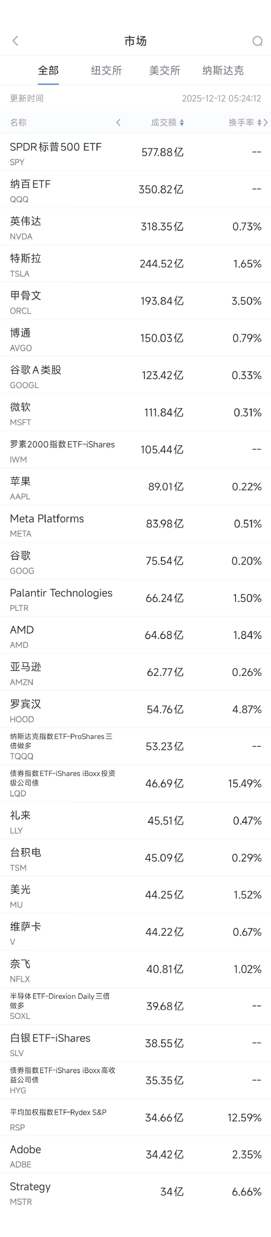 12月12日美股成交额前20:甲骨文财报重燃AI科技股估值担忧