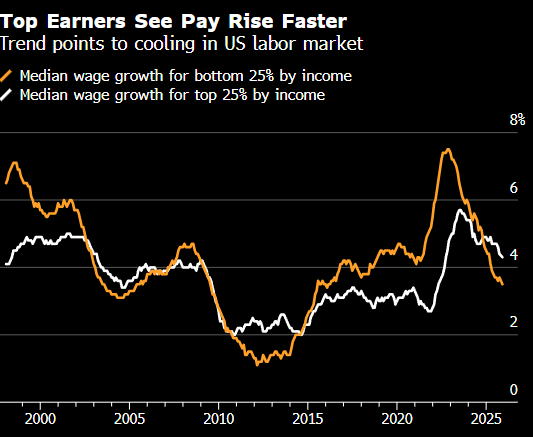 各种薪资增速指标都显示,目前工资涨幅已经降到四年来最低,且低收入人群的薪资涨幅低于高收入人群,这加剧了今年所谓“K型经济”中不平等扩大的趋势。