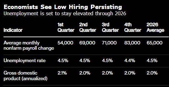 经济学家表示,他们预计2026年GDP将增长2%,动力来自稳健的消费者支出和强劲的企业投资。然而,根据调查得到的预估中值,招聘将像2025年一样保持低迷,明年的平均失业率将高于今年。