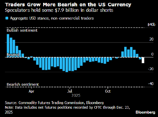 目前市价已反映出对美国明年将至少降息两次的预期,美联储的这种政策路径与部分发达国家央行相背离,削弱了美元的吸引力。根据周三公布的数据,交易员们在截至12月23日当周增加了美元空头头寸。期权指向美元1月将进一步走弱,但在之后几个月里势将有所缓和。