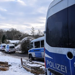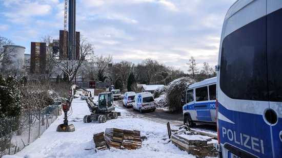 2026 年 1 月 4 日,德国柏林,泰尔托运河上方一座通往利希特费尔德发电站的桥梁发生纵火袭击后,现场停放着警车与电力抢修设备,工作人员正着手修复受损电缆。这场火灾导致柏林西南部地区停电,4.5 万户居民以及当地的商铺、医院和养老院均受波及。柏林电网公司称,目前已为约 7000 户居民恢复供电,但其他受影响用户恐怕还需等待。