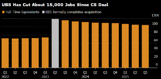收购瑞信后,瑞银的员工人数从7.4万人增至略低于12万人。此后员工规模在每个季度持续缩减,截至去年第三季度末已减少约1.5万人。