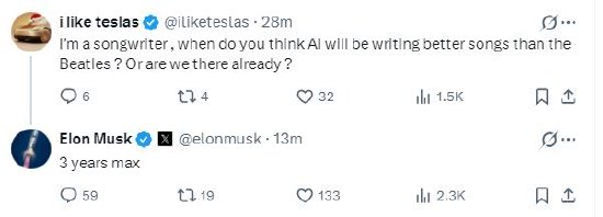 一位网友在社交平台X上询问:“我是一名歌曲创作者,你认为AI什么时候能创作出比披头士更好的歌曲?或者我们现在已经能做到这一点了?”
