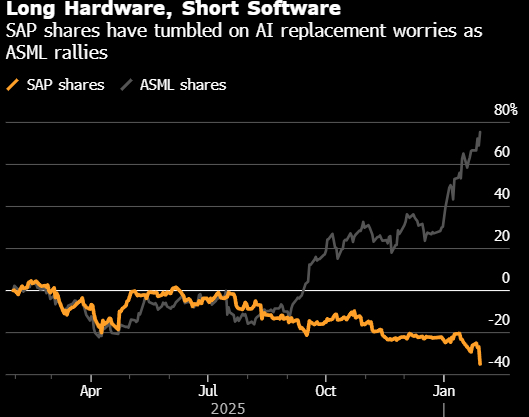 软件公司SAP SE股价创下逾五年最大跌幅,因第四季度云业务订单积压量下滑至首席执行官Christian Klein此前所称的“令人失望”水平,加剧了市场对人工智能将颠覆软件行业的担忧。