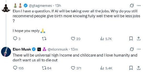 有网友问,“埃隆,我有个问题。既然人工智能终将接管所有工作,你明明清楚未来就业岗位会减少,为什么还建议大家多生孩子呢?”