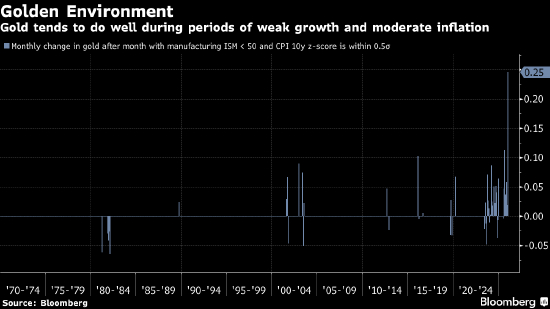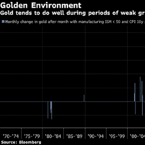 我们可以通过经济数据的一些简单定义来阐述这一点。假设美国整体CPI处于其10年平均值的半个标准差范围内时,通胀无论高于还是低于平均都不是紧迫问题。再假设ISM制造业指数低于50意味着经济正在蹒跚而行,尽管尚未陷入衰退。如今服务业是美国经济的大头,但虽然制造业重要性下降,但制造业ISM依然是一个相当不错的周期指标。下表显示了在CPI和ISM符合上述标准后次月的黄金回报率。
