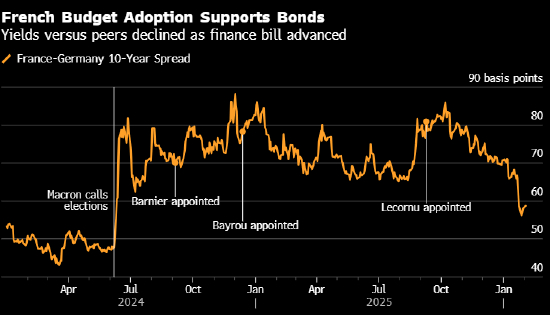新预算案的支出削减和增税幅度均小于之前的提案,这意味着2026年预计为5%的赤字率将高于最初计划。但勒科尔尼避免了其前任Michel Barnier和Francois Bayrou的命运,两人均因在紧缩措施上的分歧而被国民议会迫使辞职。