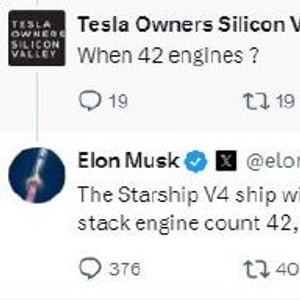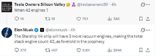 马斯克在X平台上回复“特斯拉硅谷车主俱乐部”询问时表示:“星舰V4将增加3台真空发动机,使全栈发动机总数达到42台,正如预言中所述。”