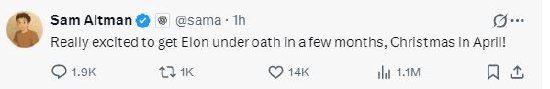 奥特曼随后在另一条帖子中写道:“真的很期待几个月后能让埃隆宣誓作证,那将是四月的圣诞节!”