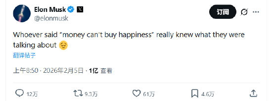 “谁说的‘金钱买不到幸福’?说的太对了。”马斯克两天前在X平台上写道。目前这条帖子的浏览量已超过1亿次。