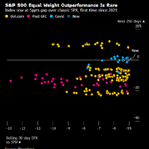 标普500等权重指数在滚动30日区间内的表现跑赢标普500指数超过5个百分点,幅度为新冠疫情以来首见。