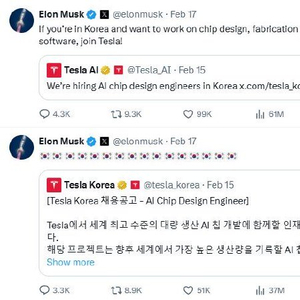 马斯克于当地时间17日在其社交平台X上转发了特斯拉韩国分部发布的人工智能芯片设计工程师招聘信息。