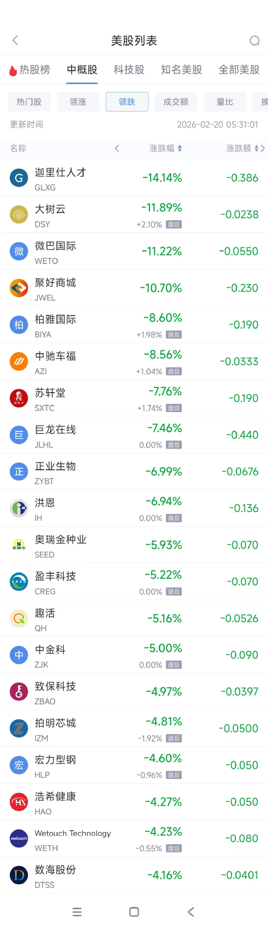 领跌中概股列表: