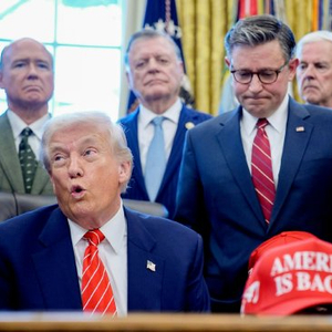总统唐纳德特朗普与众议院议长迈克·约翰逊及国会参众两院其他共和党议员共同出席2月3日的法案签署仪式并发表讲话特朗普与众议院议长迈克·约翰逊及国会参众两院其他共和党议员共同出席2月3日的法案签署仪式并发表讲话