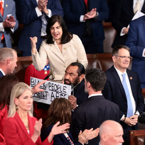 美国得克萨斯州民主党议员阿尔·格林被护送离开活动现场。自特朗普步入会议厅那一刻起,格林就始终高举写有“黑人不是猿猴”的标牌——这直指特朗普曾发布种族主义视频,将美国首位黑人总统巴拉克·奥巴马描绘成猿猴的行为。格林去年也因扰乱特朗普演讲而被强制带离会场。