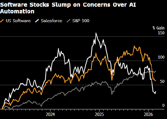 科技公司近期被卷入所谓“AI恐慌交易”。在包括Anthropic PBC在内的一些初创公司接连祭出新动作后,市场再度对该行业的短期前景产生疑虑。本周早些时候,名不见经传的Citrini Research在博客文章中勾勒出AI快速进步可能带来剧烈冲击的情景,令外界更为担忧软件行业在AI快速发展面前的脆弱性,进一步加深了跌势。