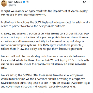 OpenAI创始人奥特曼在社媒发文称,今晚,OpenAI与“战争部”(美国防部)达成协议,将在其机密网络中部署OpenAI的模型。