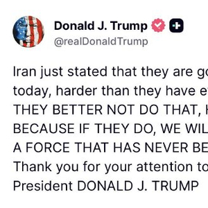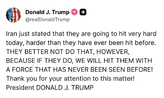 特朗普在社交媒体发文:伊朗刚刚宣称他们今天要发动非常猛烈的打击,比以往任何时候都要猛烈。他们最好别这么做。如果伊朗这么做,我们将以史无前例的武力打击他们。