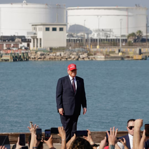 唐纳德・特朗普总统周五现身得克萨斯州科珀斯克里斯蒂港,在原油储罐背景下登台,向一小群支持者宣扬低油价的利好。