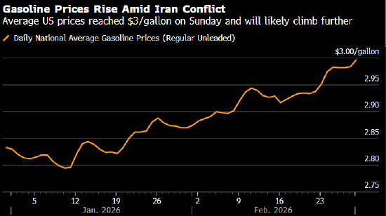 周一,随着载有原油和燃料的油轮几乎停止通行霍尔木兹海峡,汽油期货一度上涨9%。美国汽车协会的数据显示,周日美国汽油零售均价升至每加仑3美元,为三个月来最高水平。