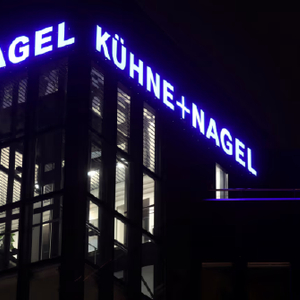 夜间大楼一角亮起蓝色霓虹灯的德迅公司标识。公司航空物流业务第四季度货运量同比增长 7%。