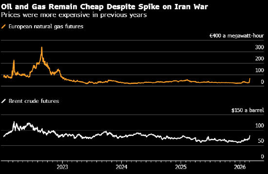 然而,尽管价格飙升,此次波动幅度远小于以往危机。布伦特原油周一虽跳涨,但仅触及2024年以来最高;欧洲天然气价格暴涨39%,与2021-22年能源危机的剧烈波动相比,也几乎算不上什么大动静。