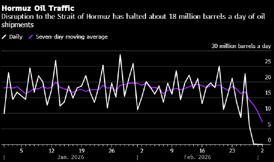 过去三天里,石油和天然气交易商目睹了全球能源供应最糟糕的局面正在上演。霍尔木兹海峡的油轮运输几乎陷入停滞,全球五分之一的石油产量经此通道运输。伊朗的导弹和无人机袭击迫使全球最大的液化天然气设施和沙特阿拉伯的最大炼油厂双双停运。