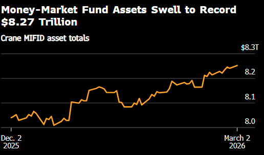 随着伊朗战争引发广泛避险资金流入,美国货币市场基金总资产升至8.271万亿美元,创纪录新高。